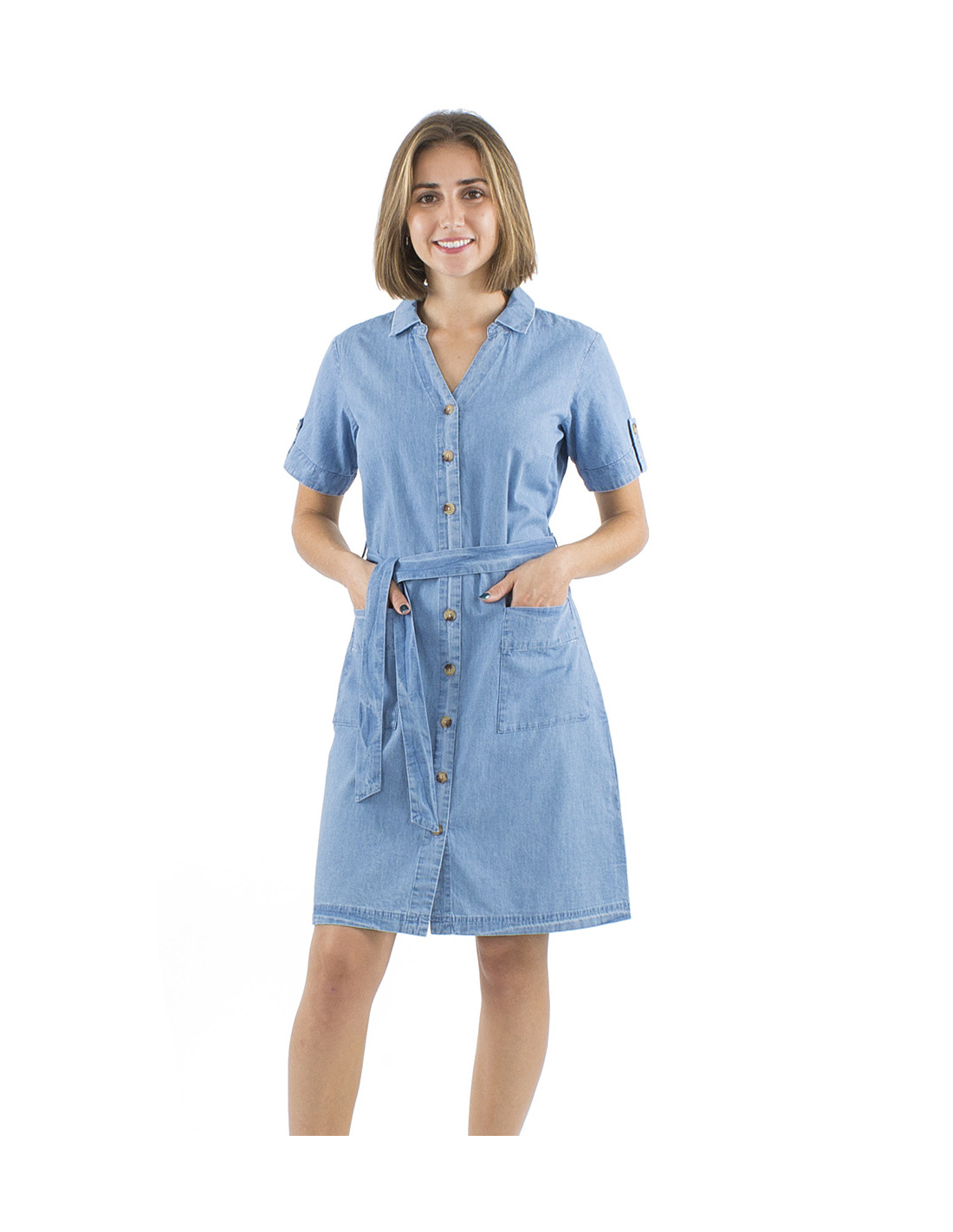 Robe coton denim boutonnée manches courtes col